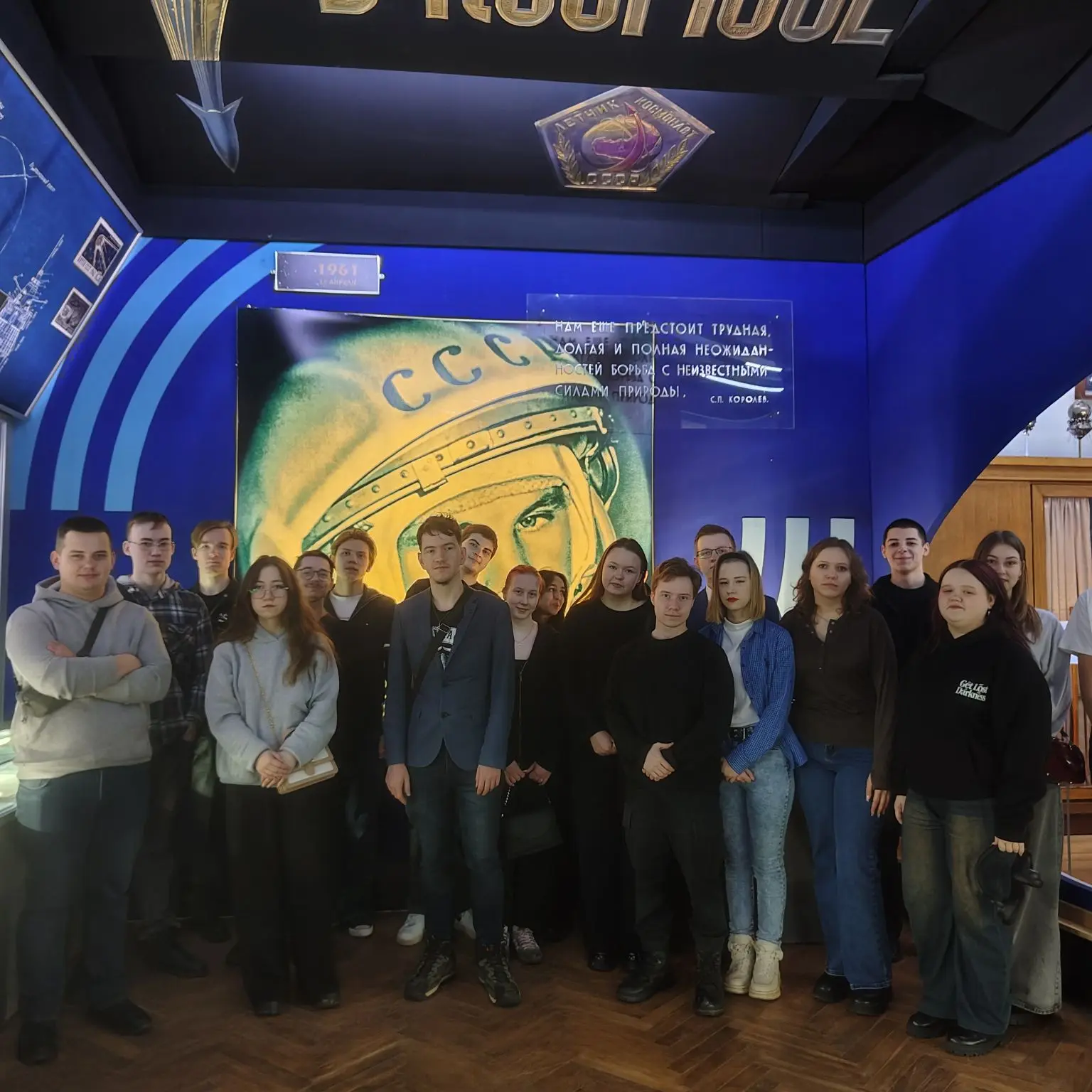 Музей посвящен достижениям России в освоении космоса. Среди экспонатов студенты увидели восстановленную капсулу Восток-1, в которой Юрий Гагарин совершил первый полет, капсулу Восход-2, из которой Алексей Леонов совершил выход в открытый космос, капсулу Зонд-5, которая совершила первый облет луны и вернулась на землю.